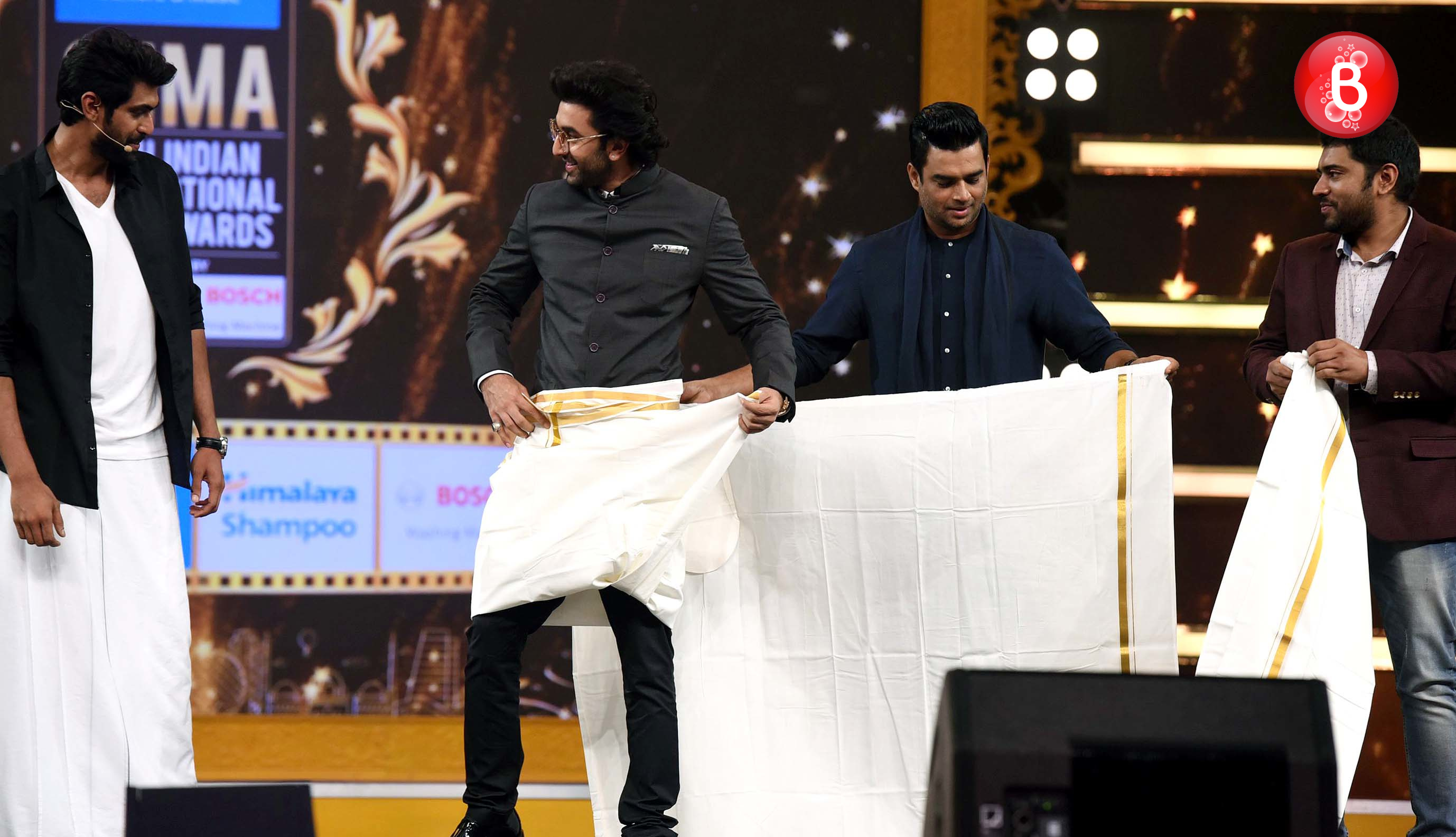 And Madhavan looks as Ranbir seems to be enjoying himself, wearing this new ensemble, mundu. Katrina seems amused too.