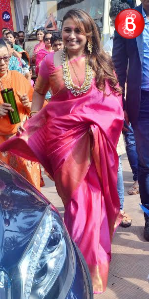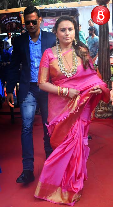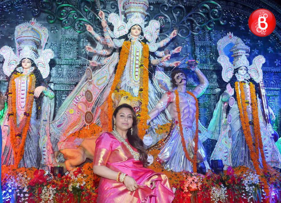 It was a big night for filmmaker Aditya Chopra on Monday as the trailer of his comeback directorial ‘Befikre’ was launched at Eiffel Tower with lead stars Ranveer Singh and Vaani Kapoor. Back here in India, his loving wife Rani Mukerji was seen arriving at the Durga Puja Pandal on Monday to seek blessings for her and of course Aditya, his comeback film and their daughter Adira. The actress was seen wearing a pink silk saree with heavy jewellery looking beautiful as always. But what certainly felt amiss here was the presence of her little princess Adira, who will turn one in the month of December. Co-incidentally Adira’s birthday and the release date of ‘Befikre’ falls on the same day on December 9. Apart from Rani, actress Kajol was seen arriving here dressed in a yellow salwar kameez with oversized retro glares. Here we bring to you the pictures of their visit.
