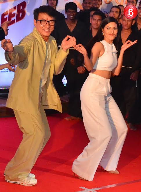 Jackie Chan and Amyra Dastur are snapped shaking a leg on the stage.