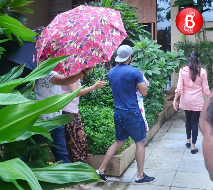 It was a couple of hours back in the morning today when we had brought to you the pictures of B-Town’s new daddy Shahid Kapoor outside Hinduja hospital. The actor’s wife Mira Rajput had delivered their first baby daughter on Friday evening here. With lots of blessings and congratulatory messages pouring in for Shahid-Mira’s little angel, we have finally got a slight glimpse of her and mummy Mira. The caring dad Shahid Kapoor was seen holding his little princess in his protective arms with a shelter of umbrella as well. The good news is that Mira Rajput has been discharged and can be seen walking ahead of Shahid. By seeing them returning home together happily, without a doubt, these pictures are the best thing we have got to see today!