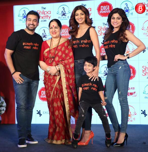 Shilpa Shetty Kundra poses for the camera along with her family at her website launch event.