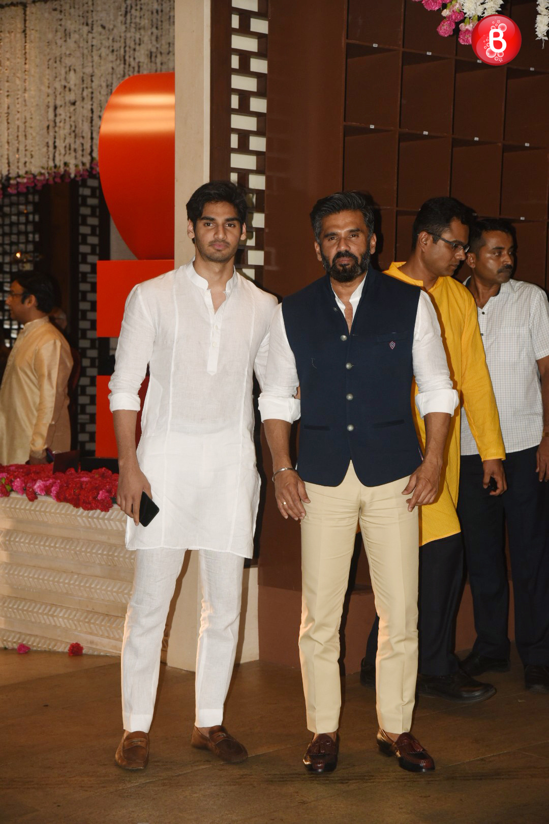Suniel Shetty with son Aahan at Mukesh Ambani's party.