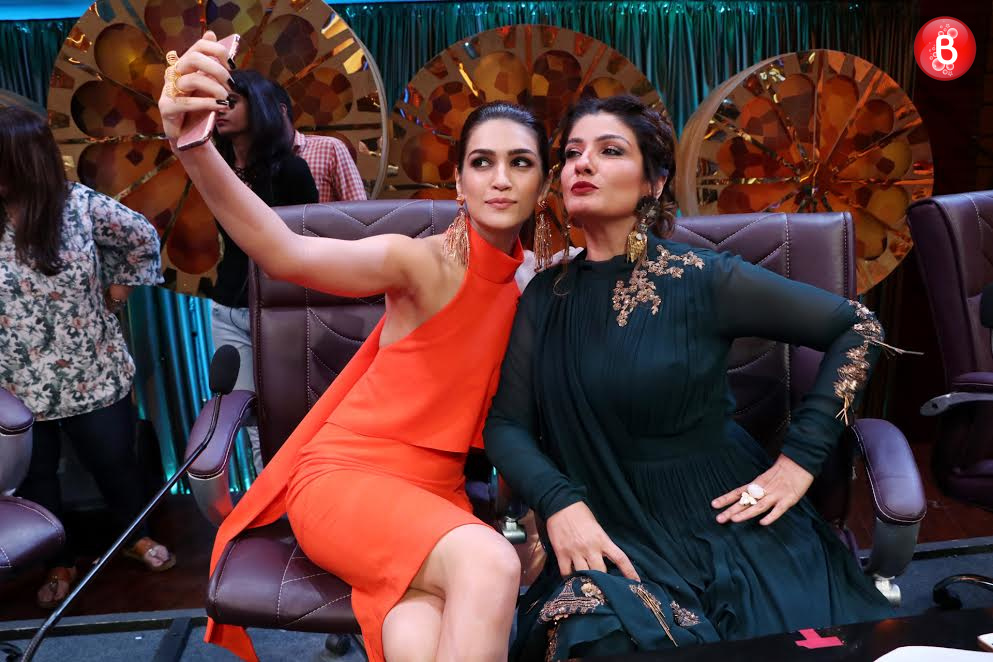 Boman Irani, Kriti Sanon, Sushant Singh Rajput, Arshad Warsi and Raveena Tandon pose for the shutterbugs on the set of the show.