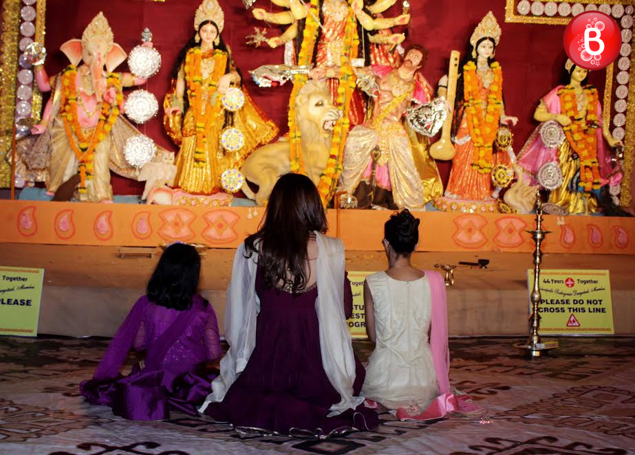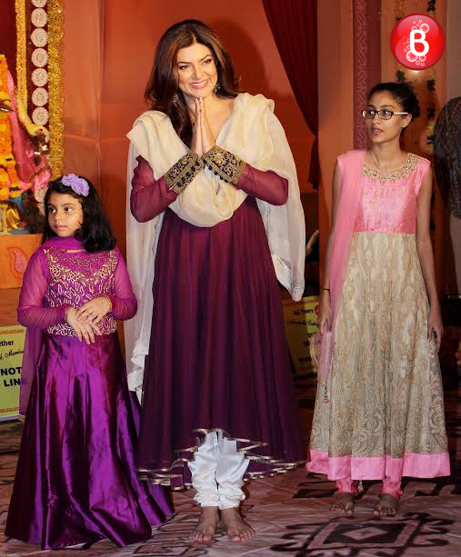 The stunning single mom of B-Town, Sushmita Sen was snapped by our shutterbugs on Friday evening as she visited the Durga Puja Pandal at Bandra. The actress was accompanied here by her darling daughters Renee and Alisah. All of them were seen seeking blessings from Maa Durga and looking at the pictures the trio is certainly looking cute. They all were dressed beautifully in a traditional attire, in sync with the festive season. Here we bring those adorable pictures of their visit.