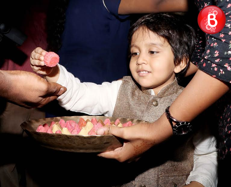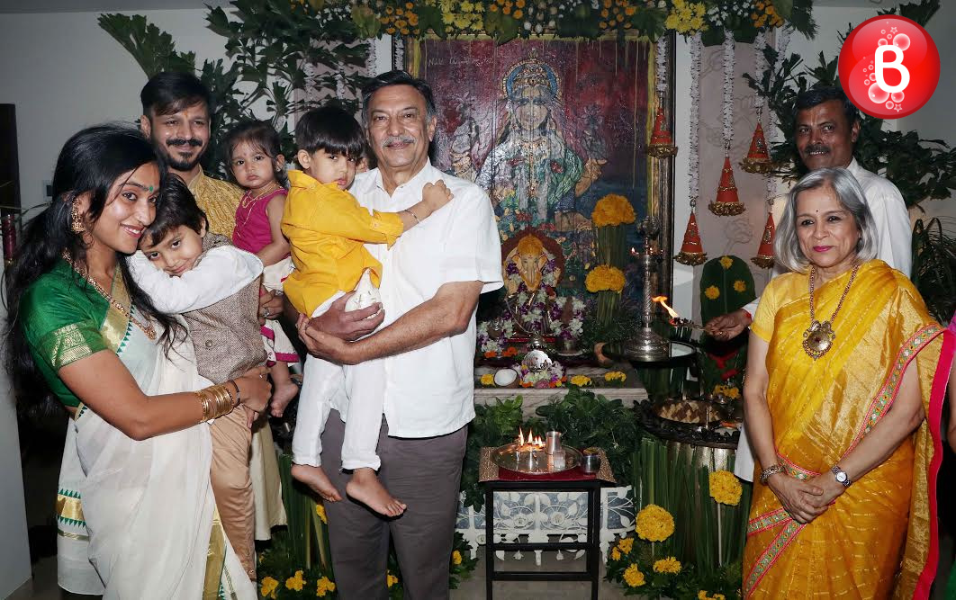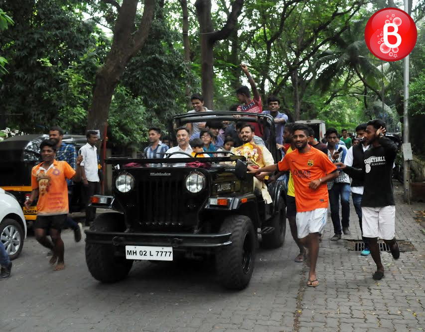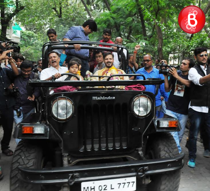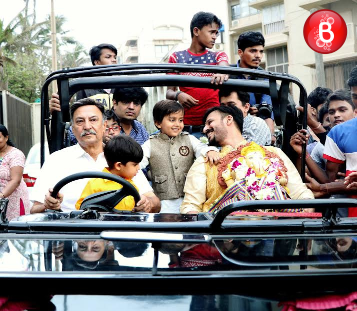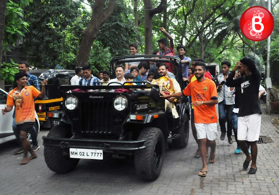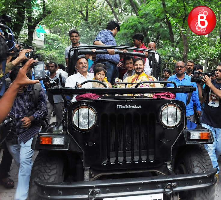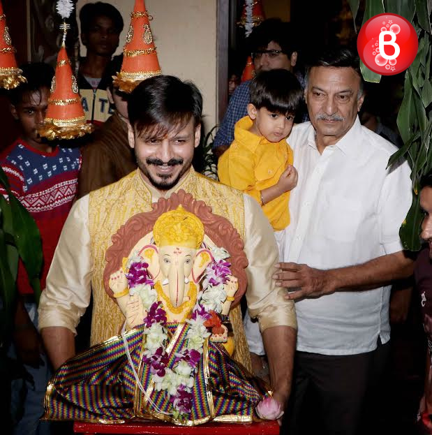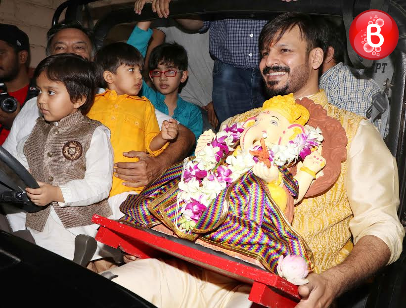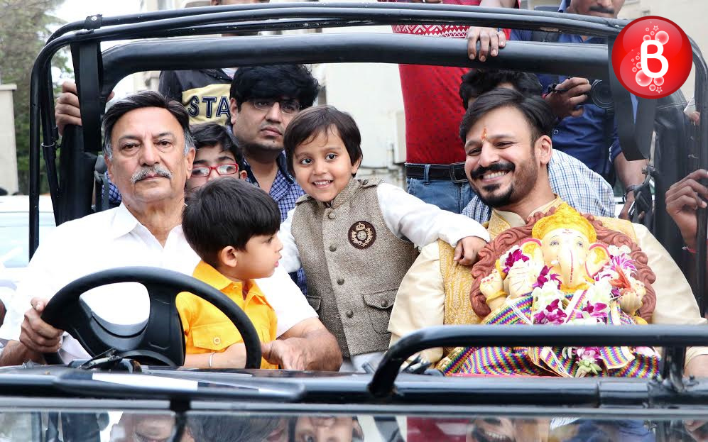 As we had reported earlier, like many other B-Town celebs actor Vivek Oberoi also celebrated the auspicious festival of Ganesh Chaturthi at his residence. Today as the fifth day arrived on Friday, Vivek was seen carrying out the visarjan of his Ganpati idol along with his family. The actor was snapped by our shutterbugs, accompanied with his father veteran actor Suresh Oberoi and son Vivaan Veer Oberoi as they took off on a ride in their jeep with the Ganpati idol in Vivek’s hands.