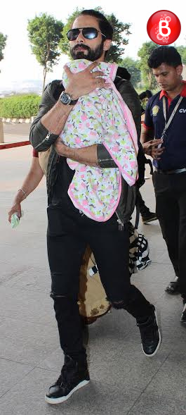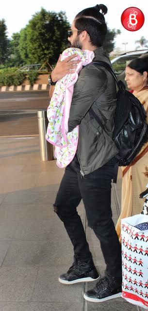 We can’t wait to catch the glimpse of Shahid Kapoor and Mira Rajput’s little princess Misha. On Wednesday morning, our shutterbugs yet again spotted this beautiful couple with their darling daughter at the Mumbai airport. Shahid was holding Misha in his arms, protectively covering her in a blanket. Three of them looked absolutely adorable. Seems like Shahid and Mira will be one of the coolest B-town parents. Take a look at this picture perfect family.