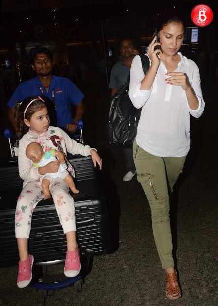 Lara Dutta looking casual in a white tee and tight fitting jeans. Her daughter Saira looks very cute sitting on the luggage bag