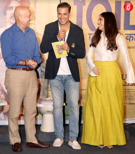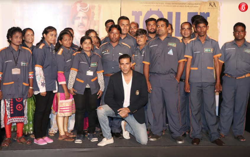 Today, actors Akshay Kumar, Bhumi Pednekar, Anupam Kher and Divyendu Sharma addressed the press at a conference for promoting their movie ‘Toilet – Ek Prem Katha’. At the event, Akshay Kumar called up on stage, the people who strive to keep our country clean. He had a chat with BMC’s clean-up marshalls who narrated incidents, followed by a media interaction. He even narrated an incident on how he stopped people from defecating in the open on beaches. (Also Read: Bhumi Pednekar addresses issues over a song from ‘Toilet – Ek Prem Katha’ glorifying stalking)