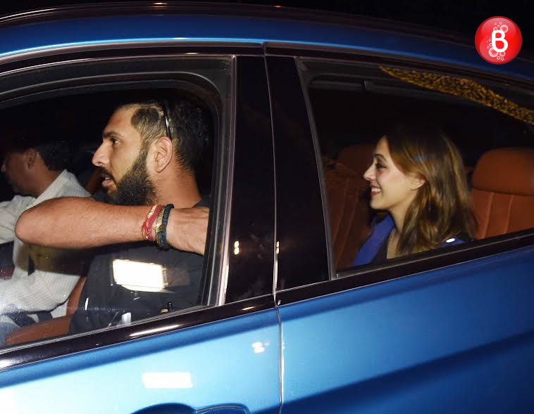 The preparations of Yuvraj Singh and Hazel Keech’s wedding have already started. And we certainly believe that the celebrations have also taken off on a grand note. On Wednesday night, the lovely couple was spotted by our shutterbugs as they left Hakkasan restaurant together. According to a report in a leading daily, they had hosted a pre-wedding dinner party for their friends. This saw the presence of producer Rhea Kapoor, designer Masaba Gupta and designer-actress Pernia Qureshi as guests. Looking at Yuvraj and Hazel’s happiness as they left the premises, here we bring you their pictures.