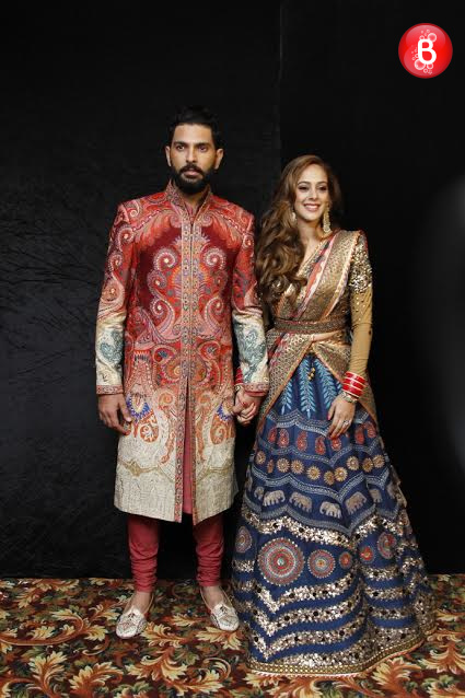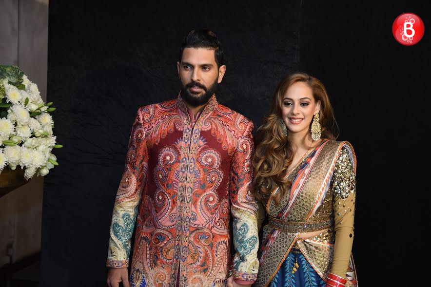 The celebrations aren’t over yet for the newly-weds cricketer Yuvraj Singh and actress Hazel Keech. Post their wedding ceremonies in Chandigarh and Goa, Mr and Mrs Singh held a grand wedding reception in the capital city on Wednesday. Hosted at a five-star hotel, this reception saw some of the high-profile guests from the world of Cricket and Politics. This included Mahendra Singh Dhoni, Harbhajan Singh with wife Geeta Basra, Sourav Ganguly, Rahul Gandhi, Finance Minister Arun Jaitley and others in attendance. With these guests, the lovely couple of Yuvraj Singh and Hazel Keech looked stunning and beautiful with their outfits. And here we bring you some amazing pictures from this grand reception.