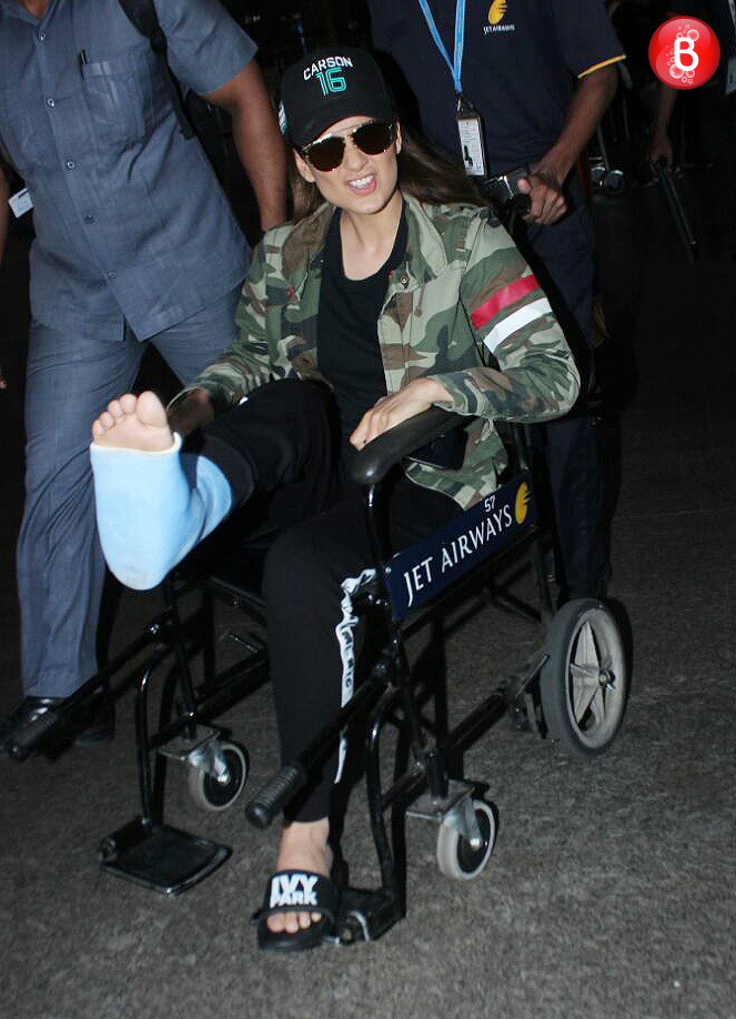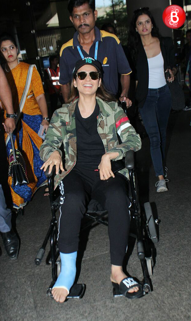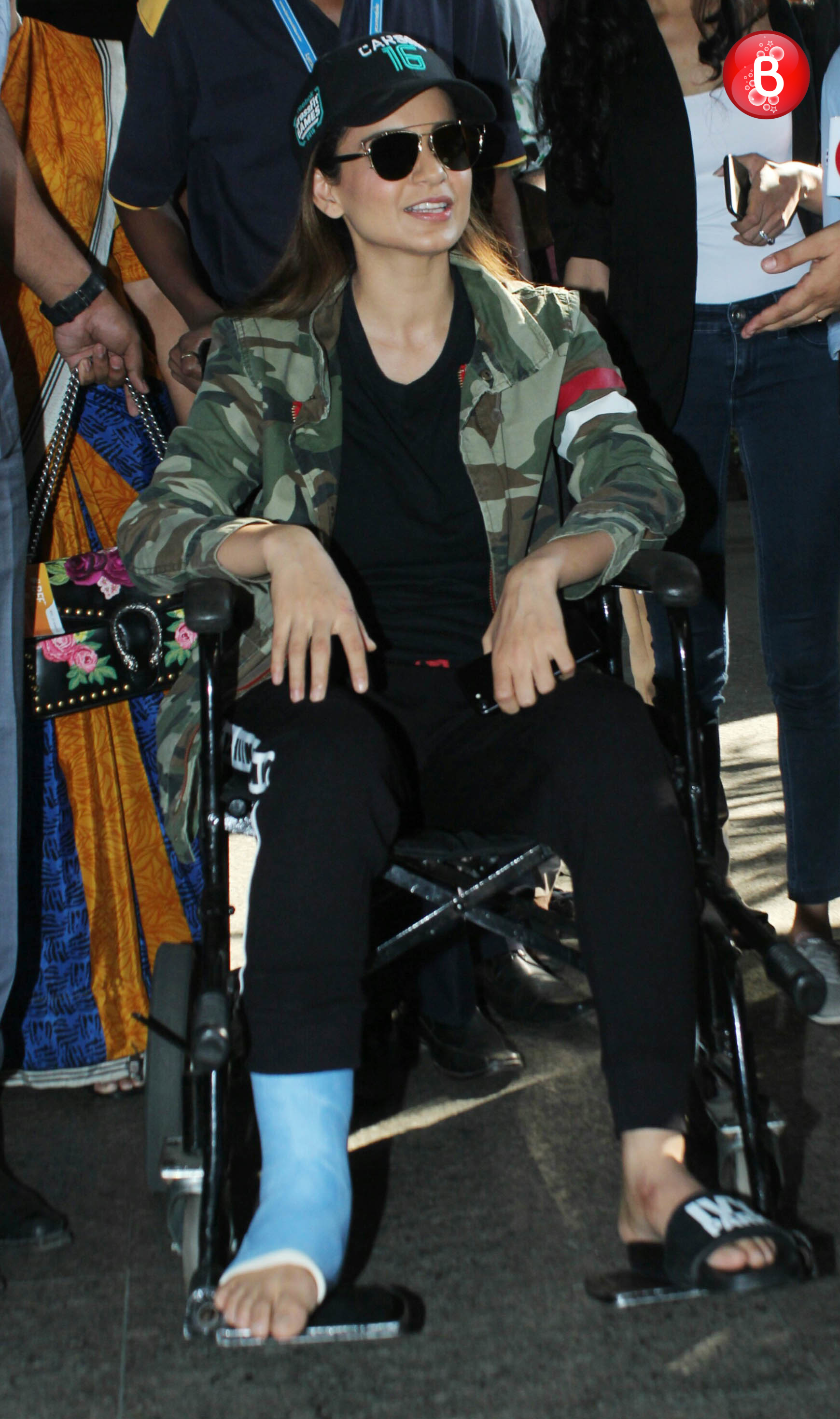 This afternoon, our shutterbugs spotted Kangana Ranaut on a wheelchair at the airport. While she was all smiles for the paparazzi, the sight of her on a wheelchair with the bandage on her leg got us worried. So, on enquiring further, a source stated that the actress injured herself while shooting for an iconic scene for the movie ‘Manikarnika: The Queen Of Jhansi’ in which Rani Laxmibai is seen fighting with her baby tied on her back.