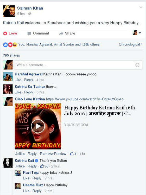 Salman welcomed his ex, Katrina on Facebook and also wished her on her birthday. He wrote, “Katrina Kaif welcome to Facebook and wishing you a very Happy Birthday.”