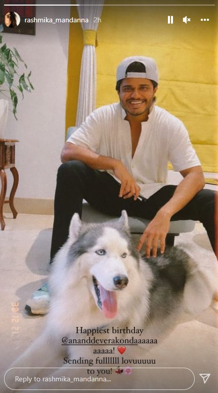 The Pushpa actress also took to her Instagram story and sent birthday wishes to Vijay’s brother Anand. Sharing a picture of the new age actor posing with their pet husky Stormi she also penned a sweet note for the actor. Rashmika Mandanna wrote,’Happiest birthday @ananddeverakondaaaaaaaaaaa. Sending fullllllll lovuuuuu to you.”