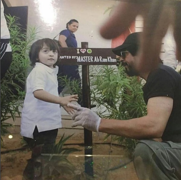 Now, we have come across a new picture where you see SRK and AbRam planting a tree together. He seems to be giving the right lessons to his son, teaching him the need to plant more trees. In the picture, SRK is wearing a black tee while AbRam is wearing a white tee, unaffected by the paparazzi. The board behind reads as “Planted by MASTER AbRam Khan”.