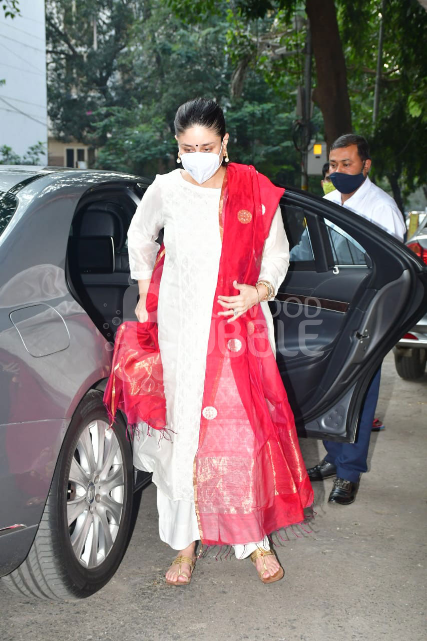 Mom to be Kareena Kapoor was spotted in the city today. She was seen wearing a white salwar suit with a red dupatta. Check her pictures here.