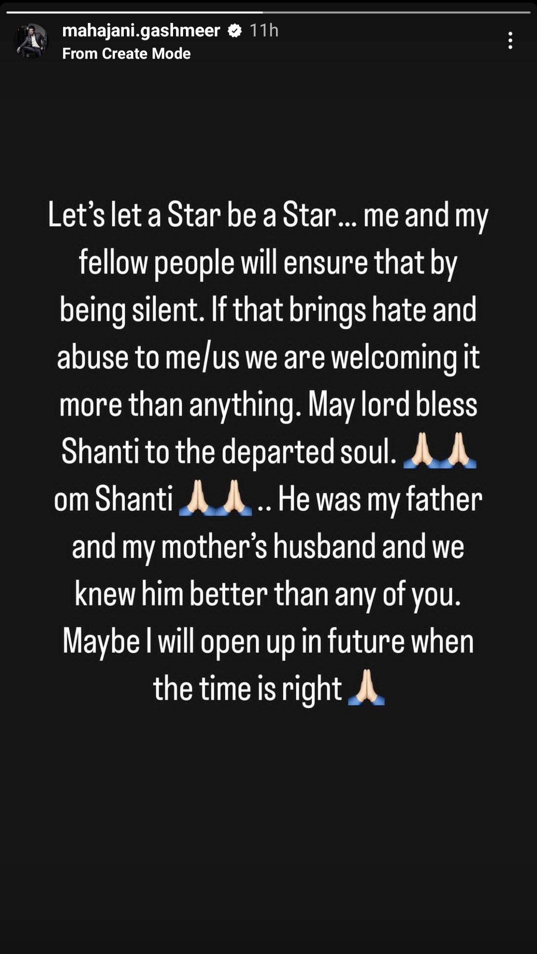 Gashmeer wrote, “Let’s let a star be a star. Me and my fellow people will ensure that by being silent. If that brings hate or abuse to me or us, we are welcoming it more than anything. May lord bless, Shanti to the departed soul… Om Shanti. He was my father and my mother’s husband and we knew him better than any of you. Maybe I will open up in future when the time is right.”