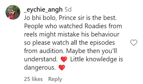 On the other hand, there were some fans who supported Prince too. One one them wrote, “Prince bhaii on fire.” Another one said, “Jo bhi bolo, Prince sir is the best. People who watched Roadies from reels might mistake his behaviour so please watch all the episodes from audition. Maybe then you’ll understand. Little knowledge is dangerous.”