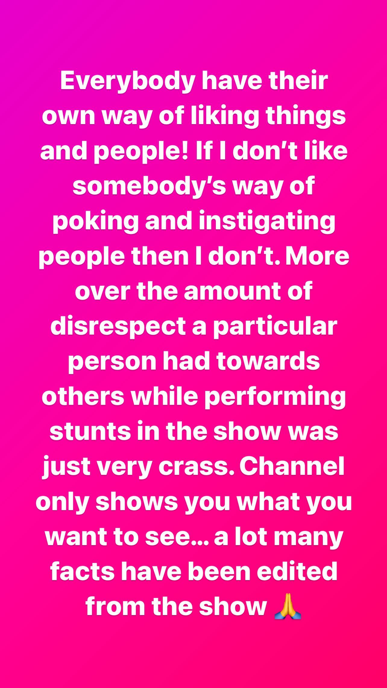 The Race 3 actor then took to her Instagram account and wrote a long note about Archana. She wrote, “Everybody have their own way of liking things and people! If I don’t like somebody’s way of poking and instigating people then I don’t. More over the amount of disrespect a particular person has towards others while performing stunts in the show was just very crass. Channel only shows you what you want to see… a lot many facts have been edited from the show.“