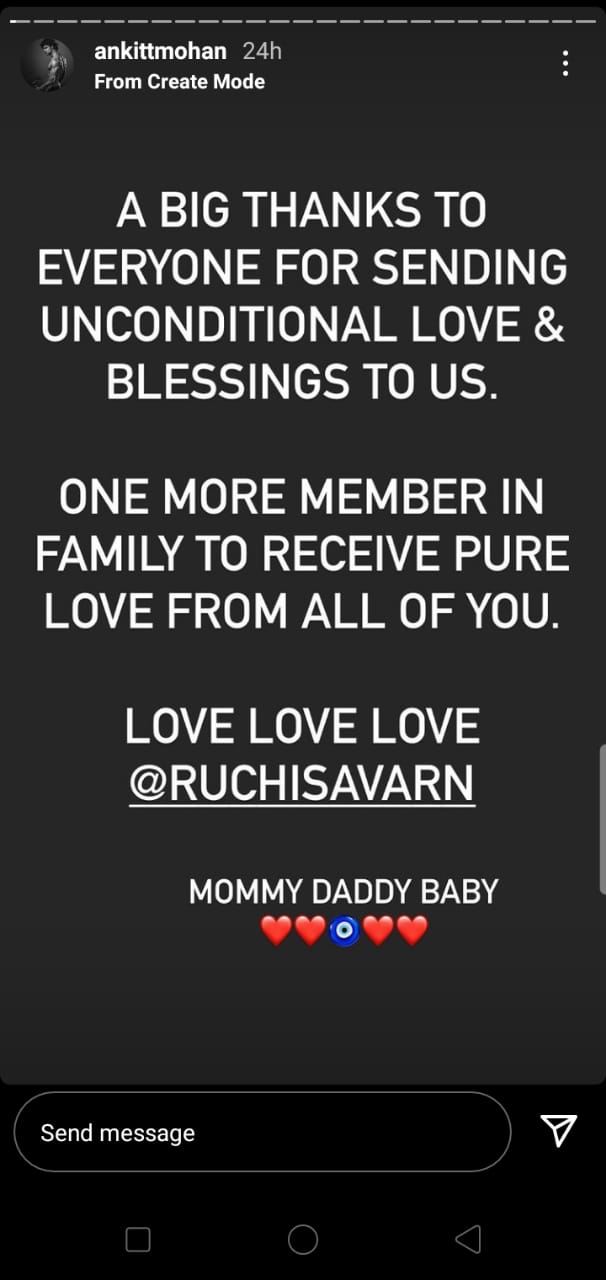 Ankitt also shared another post on Instagram, and thanked everyone for their blessings and love. He wrote, “A big thanks to everyone for sending unconditional love and blessings to us. One more member in family to receive pure love from all of you. Love love love Ruchi Savarn”.