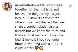 To which, Urvashi commented saying, “We worked together for the first time and believe me the journey has just begun .. i know its difficult for others to respect the fact that we share a cordial relationship as friends but we know the truth and that’s all that matters .. it was the best 2 months I had spending hours of working with u and this is just a start (sic).”