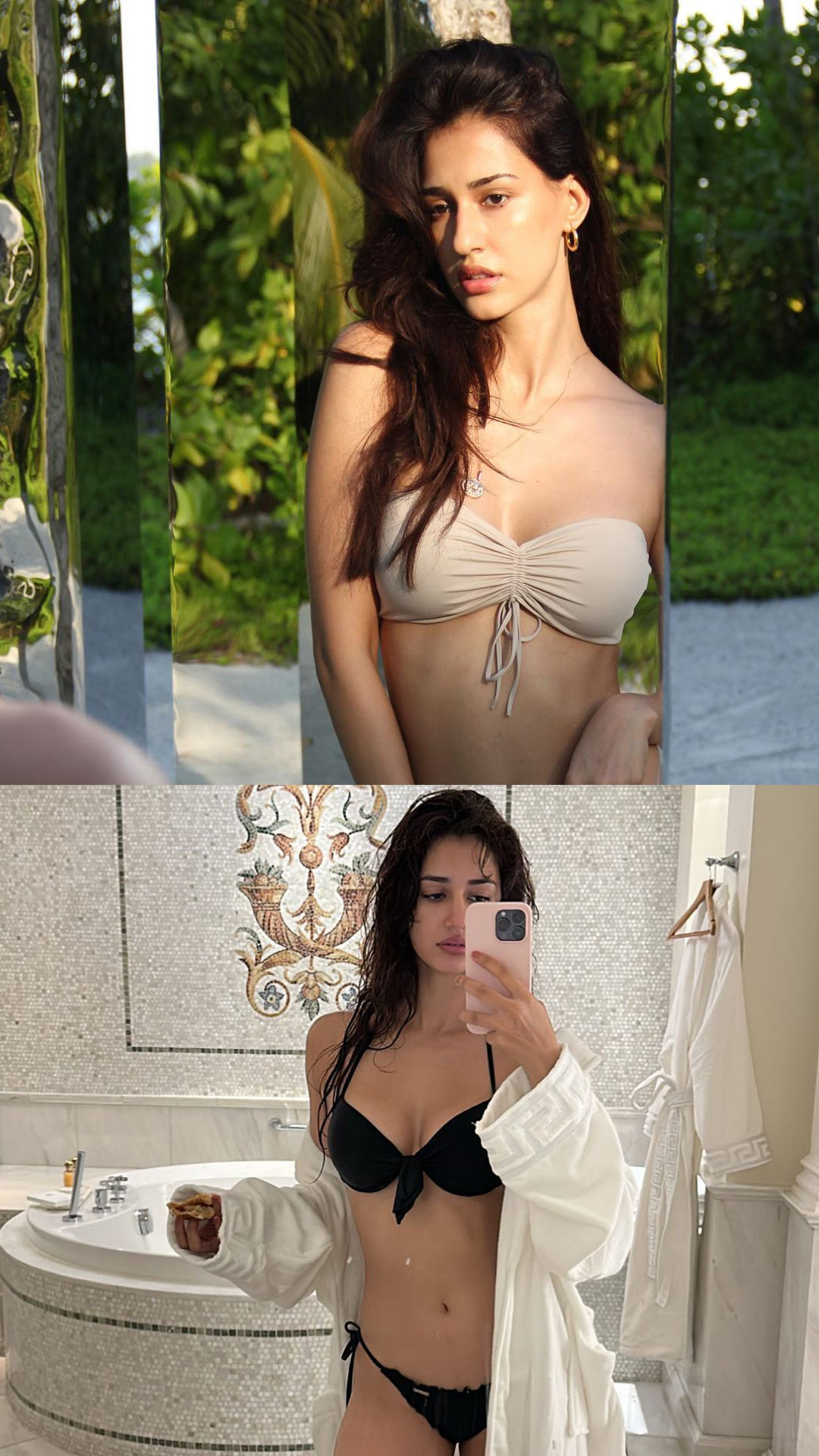 The actress flaunts her beautiful bikini body in this pic. Disha is hotness personified in brown bikini.